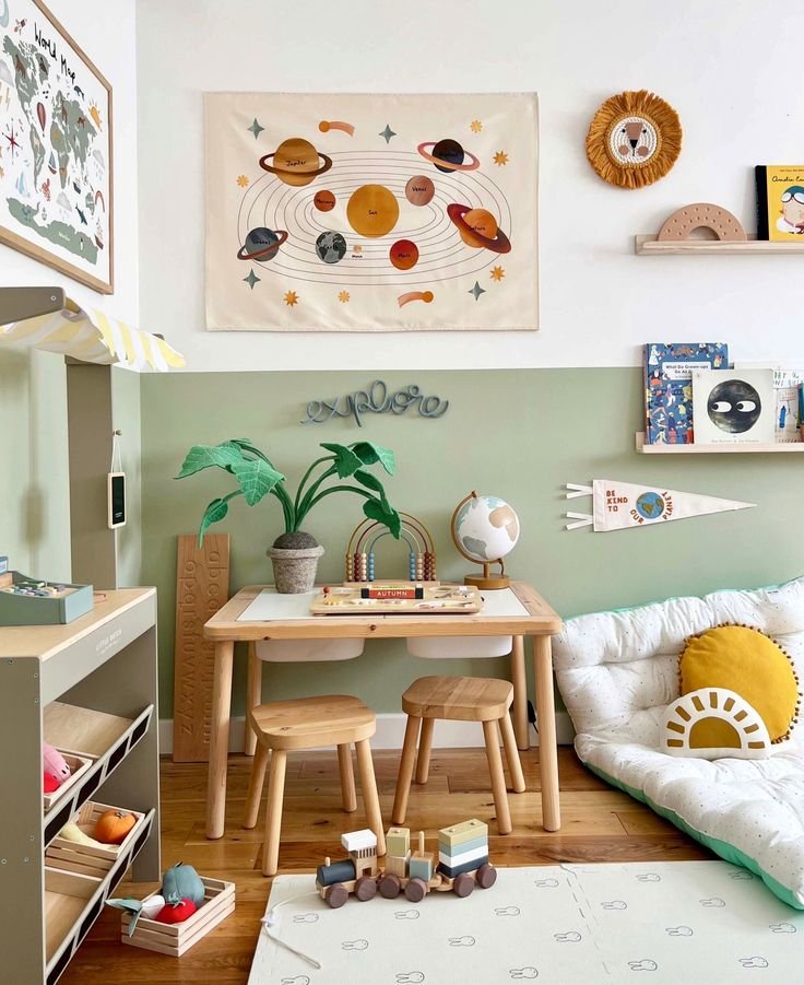 Set up an art station with a sturdy table, art supplies, and a bulletin board to display their masterpieces and playful patterns. This space will not only nurture their creativity but also serve as a constant reminder of their artistic growth over time.